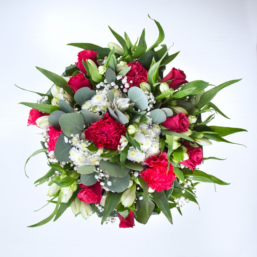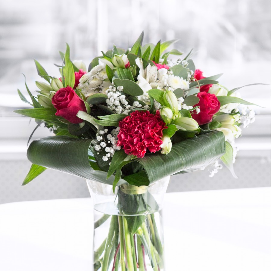 Enhance any setting with our graceful flower arrangement, featuring romantic red roses and serene white chrysanthemums. Complemented by gypsophila and adorned with white alstroemeria and aspidistra leaves, this bouquet exudes elegance and charm.